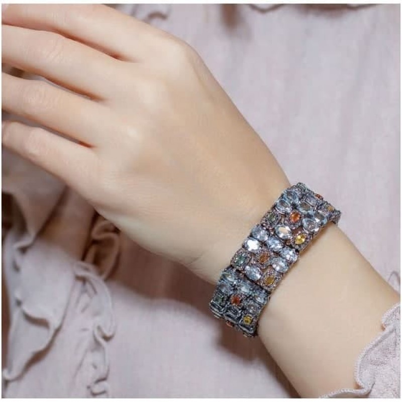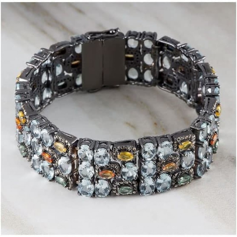 Размер изделия: 195мм*21мм Камень: Сапфир Краткое описание камня: Сапфир - разновидность благородного корунда. Как и рубин, он принадлежит к первой группе драгоценных камней, и является вторым по твердости после алмаза. На рынке сапфиры ценятся очень дорого. В 2014 году камень "Голубая красавица Азии", весом в 392 карата, был продан на аукционе Christie`s за 17 млн. долларов (44 тыс. долларов за карат). Наиболее известные сапфиры добывались в Кашмире, но на сегодняшний момент месторождение исчерпало себя, поэтому не верьте тому, кто будет продавать Вам "Кашмирские" сапфиры, если только это не старая реликвия. Сегодня сапфиры хорошего качества добывают на острове Шри-Ланка. Топовые цвета - "Королевский синий" ("Royal blue") и "Василек" ("Cornflower"). "Василек" при этом - более яркий и ценится выше. Во всеобщем представлении, сапфир - синий камень, но бывают сапфиры также желтых, розовых, "фантазийных" расцветок. Этот камень всегда был "королевским" любимцем, а новый всплеск интереса к нему случился после помолвки английского принца Уильяма и Кейт Миддлтон, в обручальном кольце которой сиял чистейший сапфир. Сегодня льдистый прохладный камень относится к наиболее желанным украшениям всех девушек мира. Лечебные свойства: Камень понижает давление, очищает кровь. Оправа из серебра помогает победить ревматизм, боли в пояснице, заболевания позвоночника. В виде кулона он нормализует сердечный ритм, лечит заболевания легких. Подходит по знаку Зодиака: Сапфир подходит всем знакам Зодиака, но особенно благоприятно повлияет на Стрельцов, Раков, Рыб и Львов. Носить его рекомендуется также, Весам. Магические свойства: Буддисты верят, что сапфир помогает сбываться желаниям. Он успокаивает, бережет от вспышек гнева. Главное свойство этого камня - он может выступать оберегом, отталкивая злость и зависть, и даже нейтрализуя черную магию. Камень: Топаз Краткое описание камня: Топаз - один из самых популярных драгоценных камней в ювелирном искусстве. По твердости он уступает только алмазу и корунду. Прозрачность и бриллиантовый блеск граней делают его удивительно привлекательным для коллекционеров. Название камень получил в честь острова Топазос в Красном море. Люди знали этот камень еще в древние времена. Так, Библия гласит, что топаз составлял часть украшения первосвященника Аарона. Королевские дворы Европы также выбирали этот камень для ювелирных коллекций. Известен, например, камень "Браганза", входящий в число регалий португальской короны. Цветовая гамма этого драгоценного камня разнообразна: существуют розовые, желтые, голубые, фиолетовые, винные топазы. Голубые топазы принято разделять на три категории в зависимости от интенсивности окраски (обычно достигаемой за счет облучения): Sky Blue - небесно-голубые, Swiss Blue - швейцарские, с более насыщенным цветом, и London Blue - лондонские, с наиболее глубоким оттенком синевы. Лечебные свойства: Топаз предохраняет от простуды, ускоряет регенерацию тканей, оздоравливает органы пищеварения, печень, желчный пузырь и селезенку. А голубой топаз в кулоне и серьгах благотворно влияет на щитовидную железу. Подходит по знаку Зодиака: Топаз подходит Скорпионам. Но в целом, этот камень достаточно нейтрален и хорошо уживется со всеми знаками Зодиака. Магические свойства: Топаз дарит хозяину хорошее настроение и оптимизм. Это камень гармонии и вну