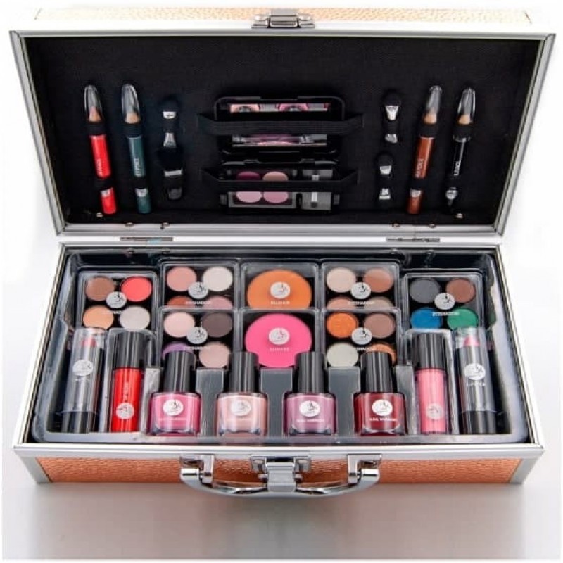 Мой первый косметический набор - лучший подарок для девочек, начинающих пользоваться косметикой. В чемоданчике есть все необходимое для созданиявыразительных и ярких черт лица, для коррекции овала, скул и губ. Двадцать четыре оттенка теней для век с широким цветовым спектромпомогут создать любой образ - от тотального NUDE до классического Смоки Айс. Румяна модных в этом сезоне оттенков - морозный румянец и нежныйперсик. Два оттенка помады для губ - насыщенный красный и фламинго - поддержат любой ваш образ. Для любителей глянца предусмотрены два блеска для губ модных в этом сезоне чувственных оттенков. Также в комплекте есть три карандаша для глаз - черный, коричневый и цвет дождя, один карандаш для губ цвета пыльнойрозы. В наборе предусмотрены кисть для румян и три аппликатора для теней и помады, модных оттенков лака для ногтей - спелая вишня, пыльная роза, нюдовый икоралловый. Чемоданчик оснащен зеркалом и футлярами для теней. Отличный подарок на все случаи жизни.