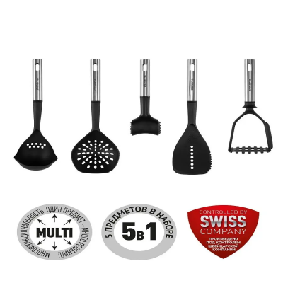 Подходят для всех видов посуды. Изготовлены из экологичных материалов: нейлона и высококачественной нержавеющей стали. Подходят для использования при высоких температурах. Все аксессуары дополнены отверстием для подвешивания. Практичность и легкость в использовании. Современный и стильный дизайн. 1) Лопатка (2 в 1: можно использовать как обычную лопатку, а удобные зубчики позволяют использовать ее также и для нарезки готовых продуктов); 2) Половник (2 в 1: мерная шкала делает использование половника еще более удобным); 3) Картофелемялка (2 в 1: удобный выступ на рабочей форме позволяет очистить стенки кастрюли без лишних усилий); 4) Шумовка (2 в 1: можно использовать как обычную шумовку, а удобные зубчики позволяют использовать ее также и для нарезки готовых продуктов); 5) Молоток для мяса (2 в 1: 2 стороны молотка для деликатной и более грубой обработки продуктов) Свернуть описание