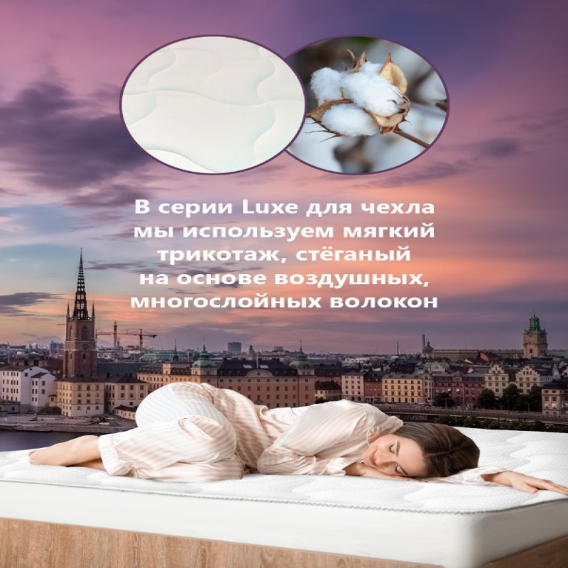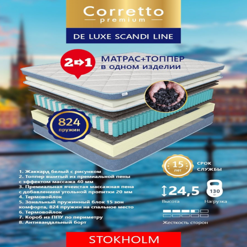 Топпер вшитый из премиальной пены с эффектом массажа 40мм, Премиальная ячеистая массажная пена с добавлением угольной пропитки 20мм, Зональный пружинный блок 15 зон комфорта,824 пружин на спальное место, термовойлок