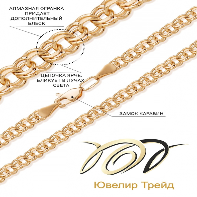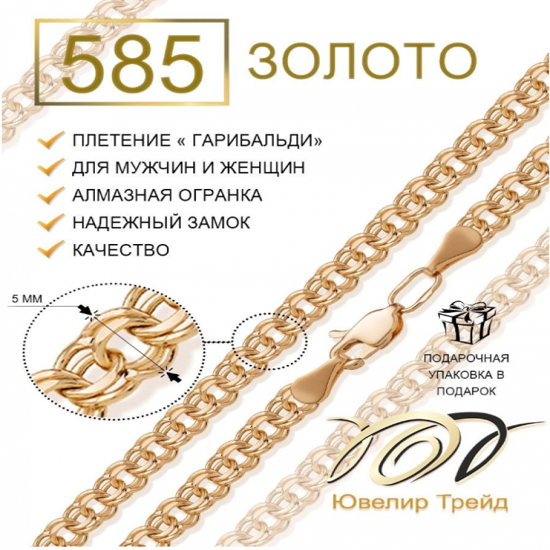 Цепь пустотелая, золото 585 пробы от производителя - лидера ювелирной отрасли (завод "Ювелир Трейд", г. Кострома). Самое популярное плетение на территории России. Плетение Гарибальди (Бисмарк) относится к так называемому якорному типу. Украшения, произведенные в такой технике, очень долговечны, а вероятность разрыва минимальная, это преимущество напрямую связано с равномерным распределением нагрузки по всей плоскости касающихся фрагментов элементов цепи и на все звенья. Для придания более оригинального и эстетичного вида проводится алмазная огранка. Цепочка подходит как подарок любимой девушке, мужчине, женщине. Поводом для подарка может быть День Рождения, Новый год, День матери, годовщина свадьбы, 8 марта, 14 февраля, 23 февраля. Изделие прошло клеймение в Российской Инспекции Пробирного Надзора. Значение веса в характеристиках является примерным и может незначительно отличаться от фактического. Ширина изделия 5 мм. Бисмарк цепь, бисмарк, цепочка бисмарк, цепочка золотая мужская бисмарк, цепочка золотая женская бисмарк, цепочка на шею, цепочка, цепь на шею, цепочка мужская, парные цепочки, цепь на шею, цепь, цепь мужская, цепь женская, цепь на шею мужская, золотая цепь, цепочка на шею, цепочка, цепочка мужская, золотая цепочка, цепочка женская, цепочка золотая, цепочка на шею мужская, цепочка на шею женская, золотая цепочка, золото, золото 585, золотые цепочки из золота 585, цепь женская золотая, золотые, цепочки из золота, цепочка золотая женская 585, золотая цепочка 585 пробы, цепь золотая мужская 585 пробы, золото 585 пробы цепочки, цепочка на шею, женская золото, колье, цепи, шнурки, цепочка на шею золото