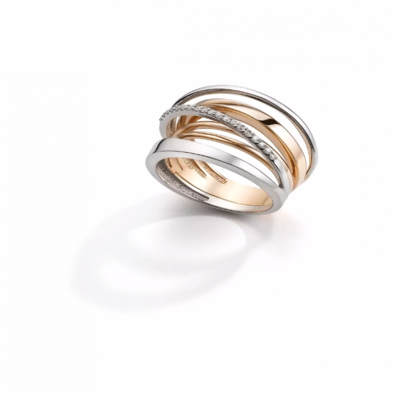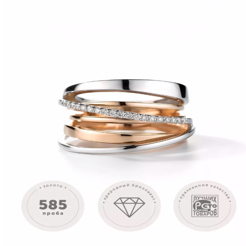 Стильное кольцо из красного и белого золота с бриллиантами, в нем вы не останетесь незамеченной! Несколько переплетённых колец создают иллюзию парящих в воздухе бриллиантов. Ширина шинки 17 мм, 19 Бриллиант Круг 57 0,137 120-200 4/5А. Каждое наше украшение - это маленький шедевр ювелирного искусства, инкрустированный природными бриллиантами премиального качества и контролируемого происхождения. Качество - наш главный приоритет! Поэтому украшения АЛЬКОР много лет подряд становятся лауреатом конкурса "100 лучших товаров России". Также в нашем ассортименте есть кольцо золотое, золотое кольцо женское, кольцо золотое 585 женское, золотое кольцо 585 пробы женская, золото 585, кольца золотое, кольцо с бриллиантом золотое, кольцо женское, кольцо на большой палец, кольцо с камнем, помолвочное кольцо. Украшения АЛЬКОР приходят в комплекте с фирменной упаковкой (конверт) - идеальный подарок любимой женщине, девушке, девочке на День рождения, Новый год, 8 марта, день всех влюбленных (14 февраля) - на любой праздник и повод. Значение веса и характеристики являются усредненными и могут отличаться от фактических.