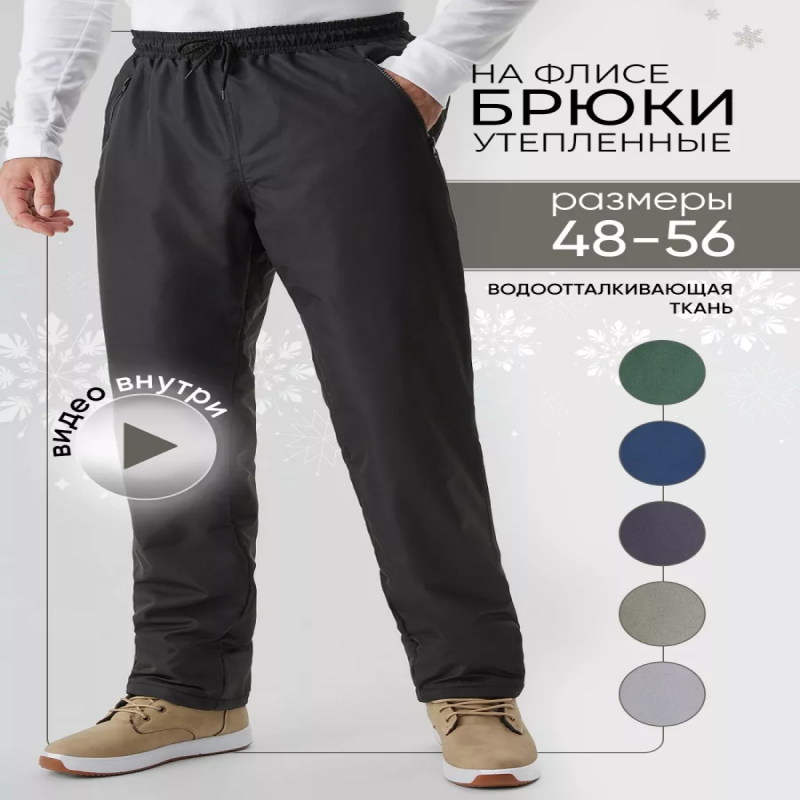 Брюки мужские спортивные теплые штаны зимние на подкладке из флиса. ВНИМАНИЕ: РАЗМЕРНАЯ СЕТКА НА ЭТИ БРЮКИ НАХОДИТСЯ НА ВТОРОЙ ФОТОГРАФИИ В КАРТОЧКЕ ТОВАРА. Основная плащевая ткань с водоотталкивающей пропиткой изнутри. Плотность утеплителя флис 180 г/кв.м. Мягкий пояс на эластичной ленте, ширина пояса дополнительно регулируется с помощью шнурка. Карманы все на молнии, два впереди и один сзади. Спортивные штаны мужские прямые черные, серые, синие, хаки утепленные в наличии большие размеры. Штаны спортивные мужские подойдут на холодную осеннюю погоду, демисезон, на зиму. Мужские брюки выполнены из высококачественной ткани, за которой легко ухаживать, не вытягиваются, не линяют. Брюки для мужчин классические на резинке, не джоггеры и не карго. Мужские штаны отлично подойдут на подарок любимому, мужу, брату, сыну, на Новый год и 23 февраля. Брюки для высоких, брюки для невысоких, на большой рост, на маленький рост, демисезонные. Спортивки мужские отлично подойдут для занятий спортом, для туризма, для походов, как горнолыжный костюм. Брючки защитные, балоневые, на резинке, с высоким поясом, зимние, для мужчин, в том числе на большие размеры, высокий рост подойдут для прогулок, для дачи и в целом для холодной погоды как базовый зимний гардероб. Всегда приятно приобрести молодежные, модные, практичные, ветрозащитные штанцы по акции недорого. Спортивки болоньевые, износостойкие, комфортные, плотные часто покупают для подростков, для мальчика, для старшеклассника, для школы, как школьная форма на физкультуру, на каток, для катания на горках, для походов, для охоты, рыбалки или как костюм лыжный, так как они качественно сохраняют тепло, как и любые флисовые штаны с начесом, только данный вариант из плащевки и не промокает. Под эти прямые брюки можно надевать также любые треники или тонкие тренировочные штаны. Теплые классические штаны трубы в целом подойдут и как спецодежда, в качестве рабочей униформы, ветрозащитные, на зиму, на сильные морозы. Свободный удобный крой штанов позволяет использовать их спортсмену, как спортивная форма или для сплава, для горных походов, для сноуборда и любого активного отдыха на природе. Трендовая модель штанов с начёсом российского производства - тренд наступающего холодного сезона, теплая подкладка из флиса и болонь сверху обеспечат вам уют и комфорт в любую погоду. Стильные штанишки с завышенной посадкой можно купить на подарок, в том числе как новогодний подарок мужчине, брату, мужу, сыну, коллеге. Теплые, мягкие, красивые, флисовые палаццо сохраняют тепло, дополнят любой ваш зимний костюм с курткой. Брюки непромокойка - хит зимнего сезона, популярная зимняя одежда. Эти теплые брюки стройнят и согревают. Однотонные классические спортивные брюки в холода можно надеть в офис в холодную погоду, если нет дресс-кода, а также в путешествие, в самолет, в лес, на прогулку, они абсолютно универсальные и практичные. Сделано в России, российское фабричное производство. Мужская одежда из плащевки и флиса - износостойкая, практичная. Плотные штаны на флисовой подкладке должны обязательно входить в мужской зимний базовый гардероб. Данные брюки могут рассматриваться как походные, они такие же теплые, как и любые брюки из футера с начесом. Штаны сохраняют тепло, ветрозащитные, с любым теплым верхом составят практичный мужск